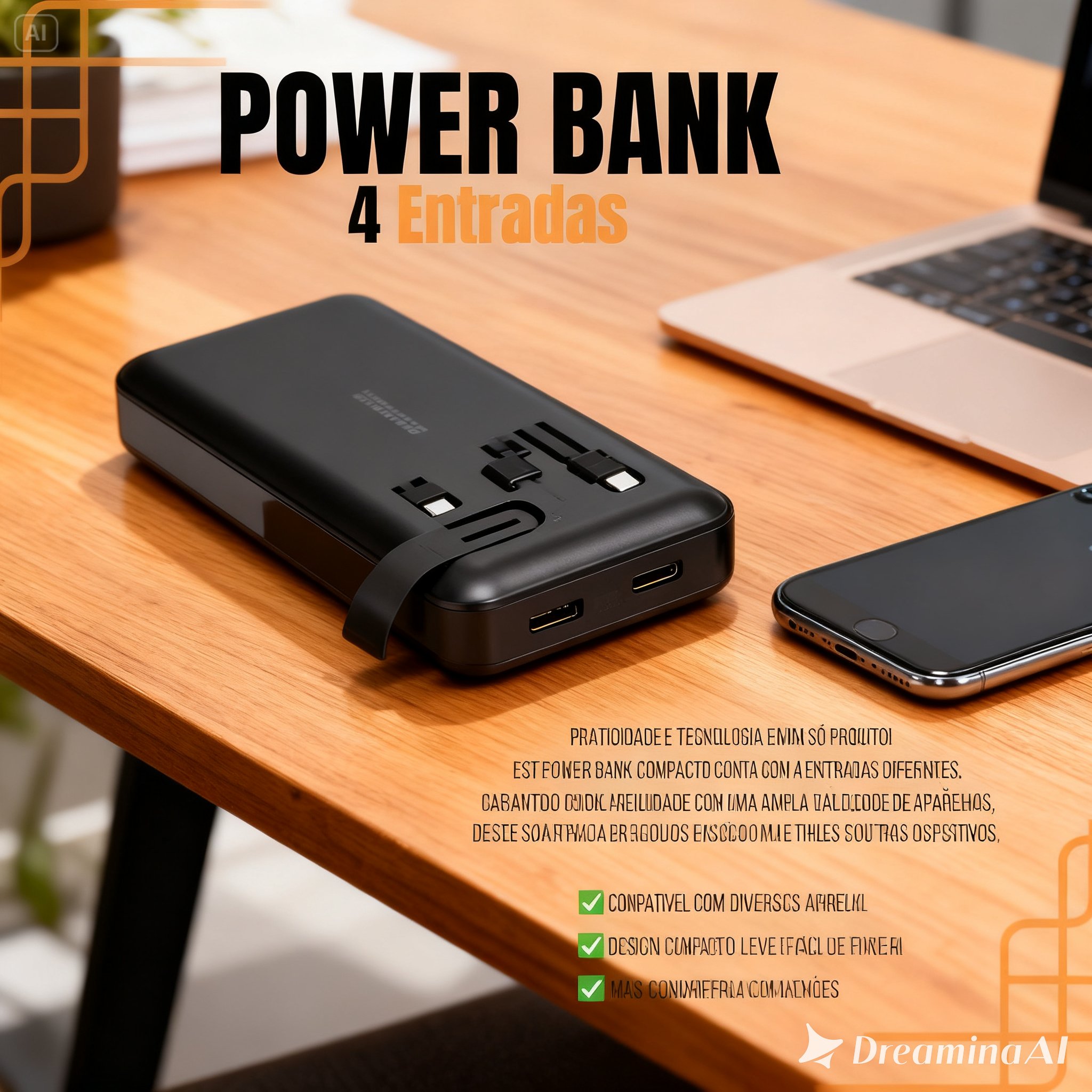 Equipado com 3 cabos embutidos (Lightning, Tipo-C e V8/Micro USB) + 1 porta USB, permite carregar até 4 dispositivos simultaneamente, garantindo autonomia em viagens, trabalho, faculdade ou emergências.