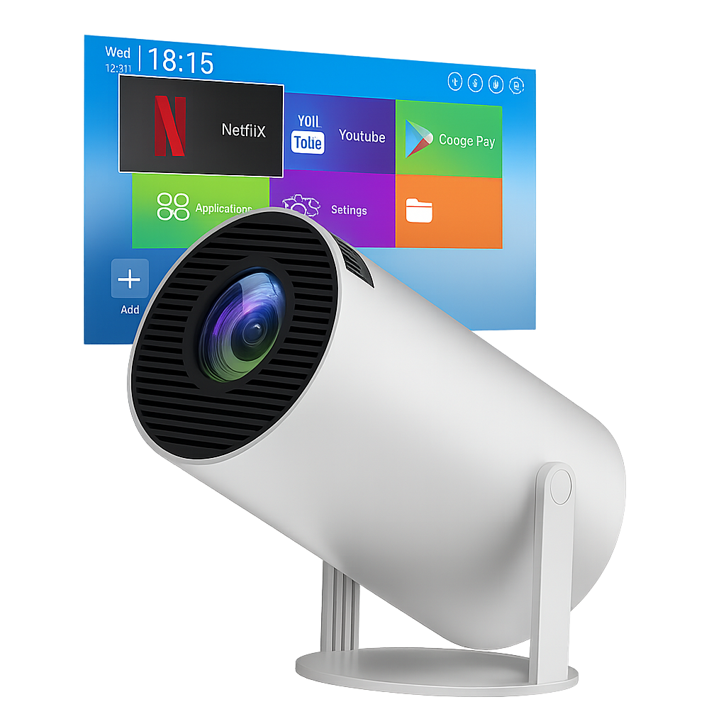 Com sistema Android integrado, o projetor oferece acesso direto a aplicativos como Netflix, YouTube e Google Play, permitindo assistir seus conteúdos favoritos sem precisar de dispositivos externos. Além disso, é compatível com Android, iPhone, TV Box, PCs, consoles Xbox e PlayStation, além de caixas de som via Bluetooth.