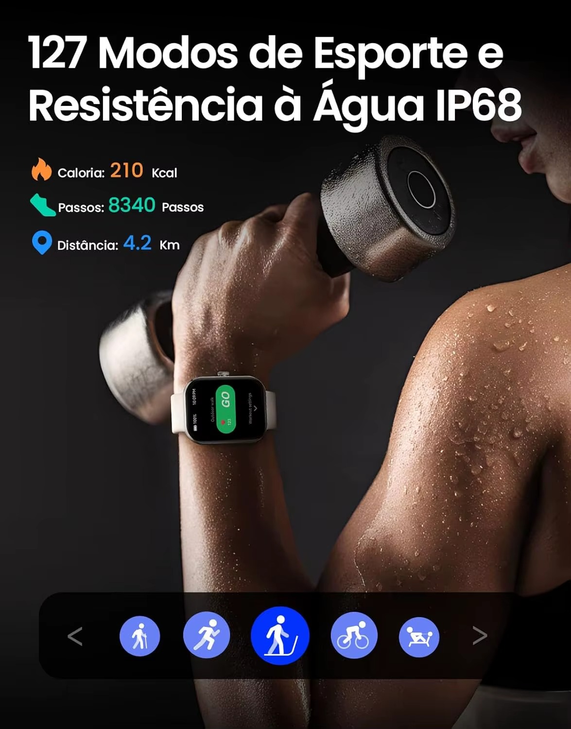O monitoramento de saúde 24 horas acompanha sua frequência cardíaca, nível de oxigênio no sangue (SpO₂), qualidade do sono, nível de estresse e ciclo menstrual, auxiliando na sua saúde diária com resultados. São 127 modos esportivos, incluindo corrida, ciclismo, yoga e natação, para manter seu treino diversificado e motivador, enquanto a certificação IP68 garante resistência contra água e poeira para uso sem preocupações.